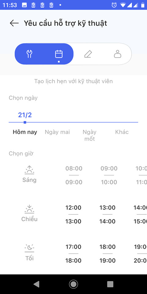 Sau khi chọn được nguyên nhận, tiếp theo người dùng chọn khung thời gian để kỹ thuật Fpt đến nhà sửa chữa. Sau đó nhập thêm ghi chú nều cần rồi chọn tiếp tục để hoàn tất bảo hỏng.